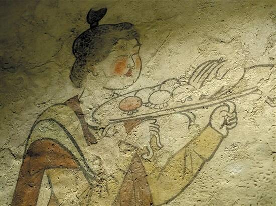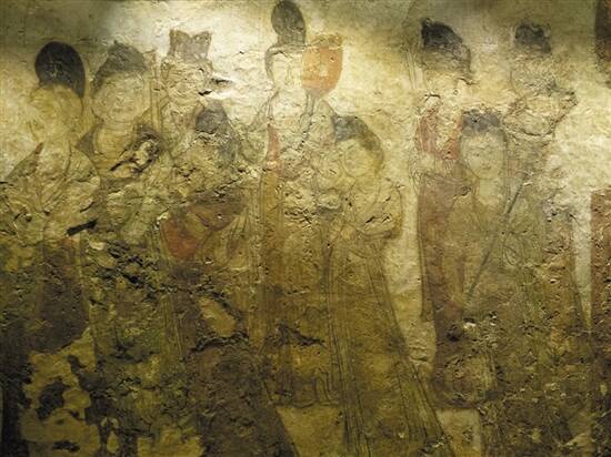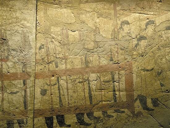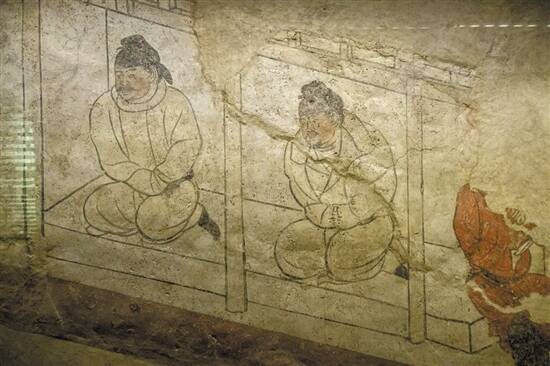 二是绘制壁画。绘制要经过三个环节,古人称“一朽、二落、三成。”一朽,就是打底稿,一般用柳木制作的炭条(古称为朽子)作为笔,如著名的懿德太子墓里《未完成的宫女图》,上面的炭条稿线至今仍清晰可见。二落,就是用墨勾线。三成,就是上色。
