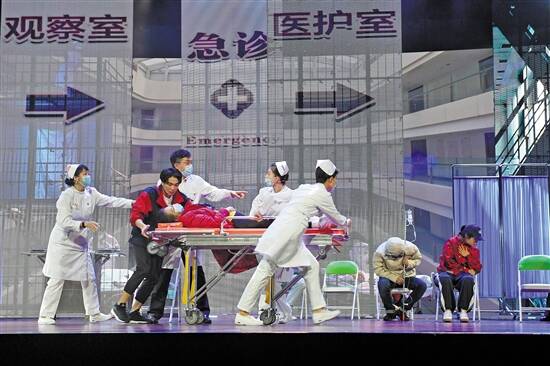 除了专业演员外,还有7名南方医科大学第三附属医院的援鄂医疗队队员,本色参演该剧“出征”和“抢救”两场戏。“没想到他们演得这么好”,导演王佳纳谈起7名援鄂队员的表现很有感触。一开始她还担心这些队员不适应表演,但表演的插管、急救都是他们的本行,“虽然不是专业演员,但比专业演员演得还要好。”