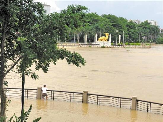 9日,因天文潮以及惠州剑潭水利工程枢纽泄洪,东江东莞河段出现江水漫堤现象 文/秦小辉(市民供图)