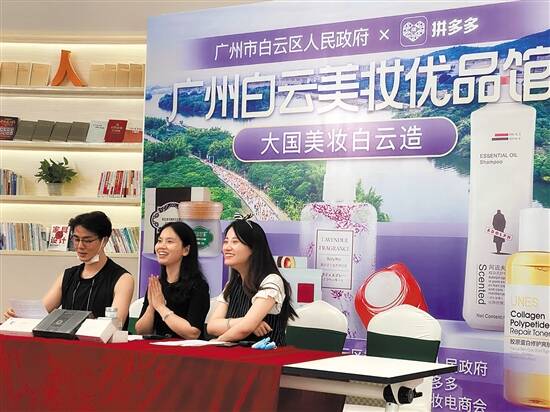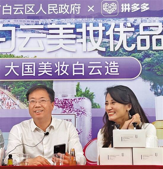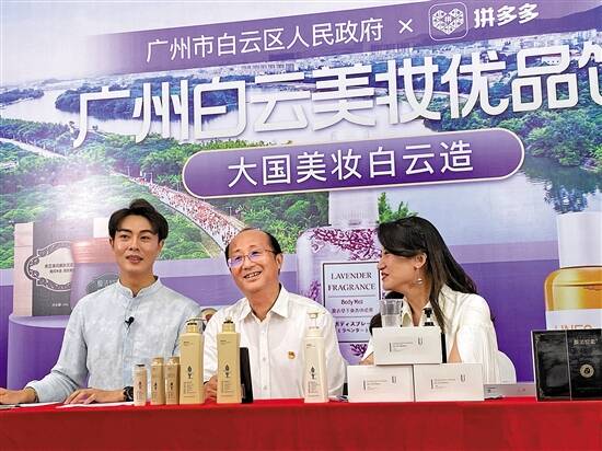 广州白云区副区长蔡胜(中)在拼多多美妆馆直播间,为网友介绍白云美妆品牌,并发放优惠福利