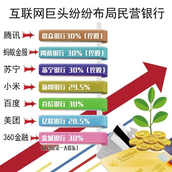 事实上,从2014年国内民营银行获批以来,民营银行“互联网化”成趋势,与互联网公司合作成为不少民营银行的选择。记者梳理公开资料发现,目前获批的19家民营银行中,至少有8家民营银行提出了互联网银行的概念,包括腾讯旗下的微众银行、蚂蚁金服旗下的网商银行以及苏宁旗下的苏宁银行等。