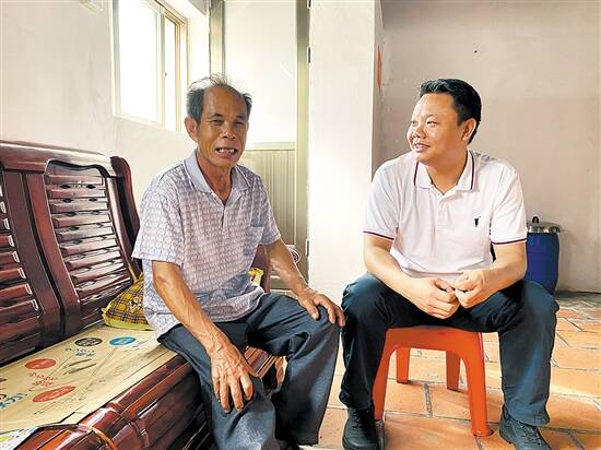 何燚斌(右)与贫困户话家常