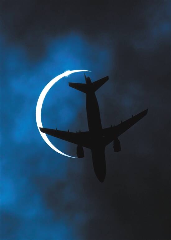 21日,拉萨一架飞机飞过发生日食的太阳 新华社发