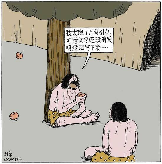 我发现了万有引力,可惜文字还没发明,没法写下来………(幽默画) □王原