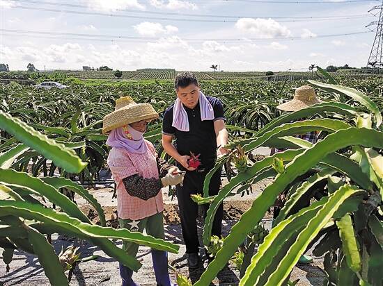 早在2017年,三水区乐平镇协助那仙村建起1000多亩的火龙果种植基地,成立了专业合作社,引进了火龙果种植深加工企业,对火龙果果实、根、茎等全系列进行加工利用。通过“龙头企业+专业合作社+基地+农户”模式,打造了集火龙果种植、销售、加工及现代农业旅游于一体的综合性持续开发式产业项目。如今,这一产业基地已成为带动当地人脱贫的聚宝盆。“我们两口子每个月在基地做工有6000多元的收入,年底还有分红,我们还在合作社专家的指导下,种了6亩火龙果。”村民周炳彬说,他们一家的日子过得一天比一天红火。