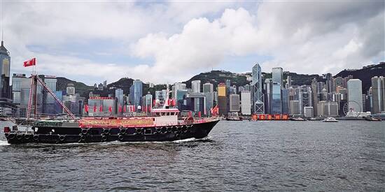 羊城晚报讯 7月1日清晨,天空碧蓝、海面澄澈。伴着欢快的锣鼓声,150艘各型渔船插上五星红旗与香港特区区旗、载着庆祝标语与各式花牌,分别从香港仔、屯门、长洲、筲箕湾出发,在港岛西环附近的海域会师后,浩浩荡荡地驶向维多利亚港。