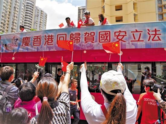 12时40分许,一列张贴着爱国标语的巡游花车驶来,现场气氛热烈,市民们一边挥舞着手中的国旗一边高喊:“香港回归,国泰民安;支持香港国安法,还我安宁社会。”