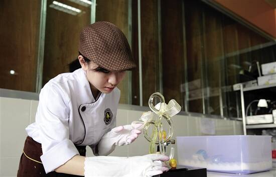烹饪专业学生陈雪仪在制作糖艺作品