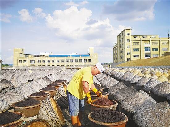 东古调味公司工人顶着烈日搅拌面豉酱原料