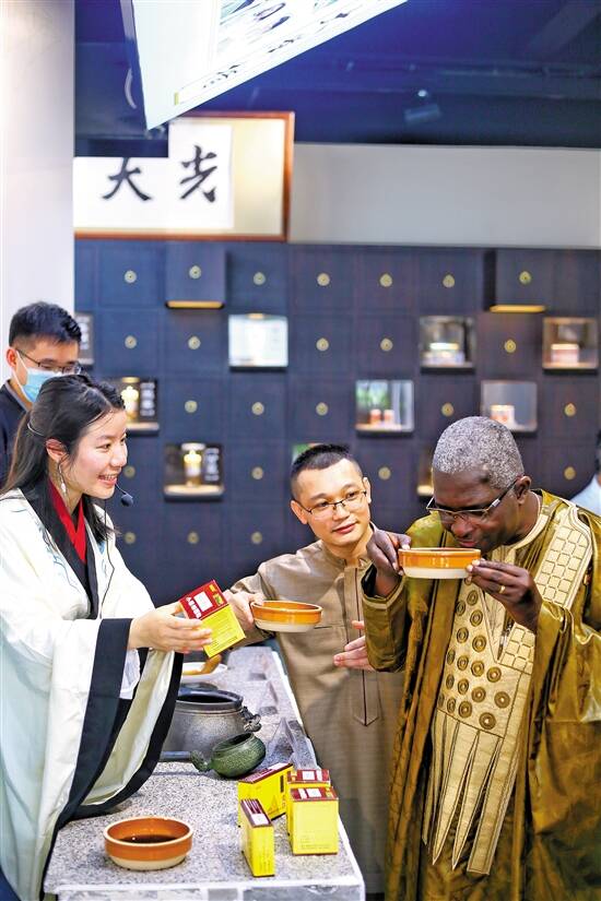 贝宁共和国驻华大使西蒙·皮埃尔·阿多韦兰德大使(右一)体验小柴胡传统制剂方法的活态展示活动
