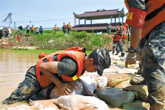 羊城晚报记者现场看到,解放军官兵在紧张地挖土装沙袋,建立临时圩堤。