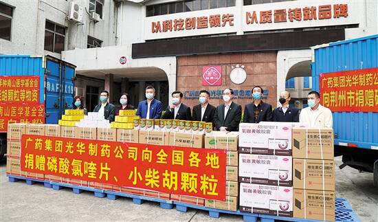 2月25日白云山光华公司磷酸氯喹片、小柴胡颗粒、小分子蛋白肽粉等药品物资全国捐赠启动仪式