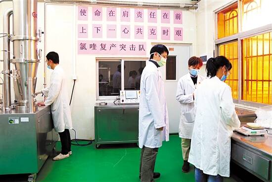 设备到位的同时,生产部门全体员工也丝毫不放松。为完成磷酸氯喹片复产任务,一线生产人员提前到岗,严阵以待,积极配合,克服排产时间紧、工作任务重等困难,每个生产工序都能做到连续生产24小时的无缝对接,使得磷酸氯喹片正式上市时间较计划又提前3天以上,实现28小时内生产出50万片合格的磷酸氯喹片这一惊人壮举。