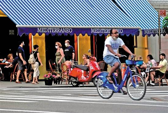 人们在美国纽约曼哈顿一家餐厅的户外餐区就餐 新华社发