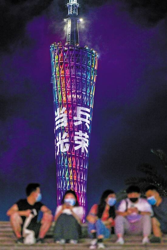羊城晚报讯 记者侯梦菲,通讯员邱晓婉、陈美报道:8月1日晚,“爱我人民 爱我军 热烈庆祝中国人民解放军建军93周年”大幅红色宣传标语,点亮广州城市地标广州塔,广大游客纷纷驻足仰望、拍照打卡。这是广州塔继2019年首次亮灯庆祝“八一”建军节后,再次亮灯致敬人民子弟兵!据悉,此次亮灯活动是广州市“八一”拥军系列活动的一个重要环节,此前广州已在花城广场、有轨主题电车、观光巴士、地铁、公交候车亭等多个场所开展了系列宣传活动,旨在庆祝人民军队光辉节日,致敬人民军队丰功伟绩,激励全市军民同心合力、携手共创全国双拥模范城“九连冠”,为实现强国梦强军梦凝聚磅礴伟力。