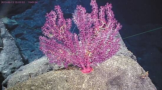 该紫柳珊瑚新种高约33cm,呈扇状,亮紫色,寓意“紫气东来”。隶属珊瑚纲、软珊瑚目、紫柳珊瑚科,2019年发现于西太平洋卡罗琳海山1549米水深。