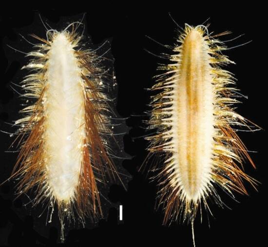 该多毛类新种长6–7cm,体覆闪亮的金色鱼叉状刚毛,犹如“黄金战甲”。隶属多毛纲、鳞沙蚕科、镖毛虫属,2019年发现于卡罗琳海山888-980米的岩石底。