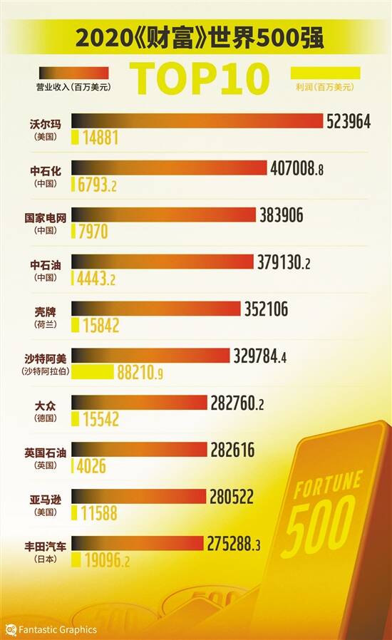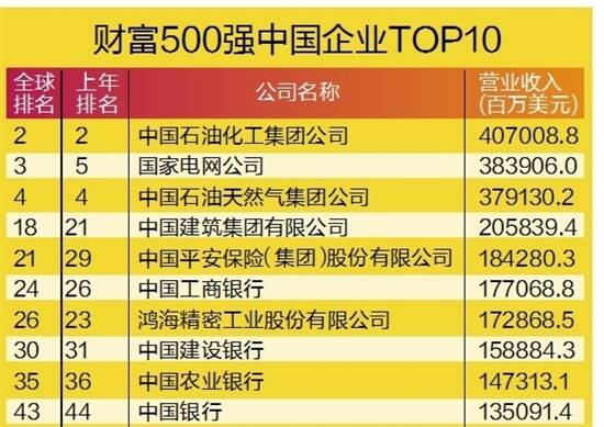 在榜单的前10名中,第2至4名被中国企业包揽,分别为中国石油化工集团公司、国家电网公司以及中国石油天然气集团公司。其中,“两桶油”的营业收入分别达4070亿美元和3791.3亿美元,排在榜单的第2位和第4位。国家电网公司则以3839.1亿美元的总营收排在第3位。其中,国家电网公司排名有所上升,“两桶油”排名保持不变。