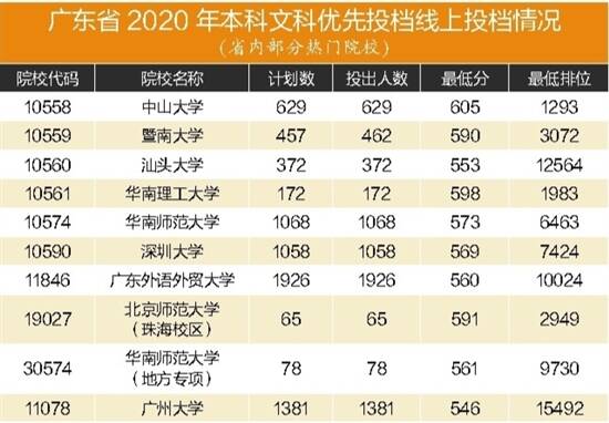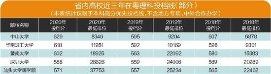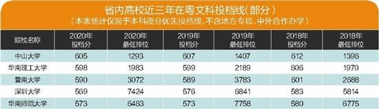 同时,省内高校投档分也居高不下。今年,省内高水平大学生源充足,大部分院校都一次性满档,且投档分数线远超高分优先投档线。其中,哈尔滨工业大学(深圳)理科投档线达652分,中山大学文、理科投档线分别为605分、629分,华南理工大学文、理科投档线分别为598分、618分,北京师范大学(珠海校区)文、理科投档线分别为591分、608分,暨南大学文、理科投档线分别为590分、602分,华南师范大学文、理科投档线分别为573分、589分,深圳大学文、理科投档线分别为569分、588分。一些新型本科院校和原二本院校异军突起,如深圳技术大学、广东财经大学理科类投档线分别超出高分优先投档线29分、15分,且两所院校理科类一次性投档均满档。