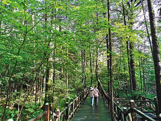 长白山参天蔽日的森林步道