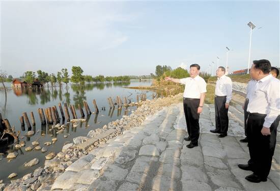 19日下午,习近平在合肥市肥东县十八联圩生态湿地蓄洪区巢湖大堤罗家疃段考察,了解巢湖主要圩口分洪和蓄洪区受灾情况 新华社发
