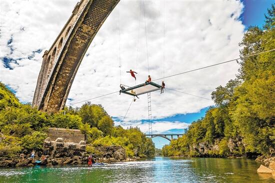 索尔坎桥的主拱跨度达85米,桥梁总长219.7米。这张巨大的飞行蹦床就安置在桥下半空中,杂技演员们时而蹦起花式动作,时而一跃跳入水中,场面相当疯狂。据说来自全欧洲各地的许多杂技演员都接到了邀请并前来参加表演。(文/CC 图/视觉中国)