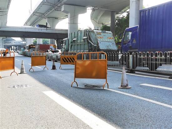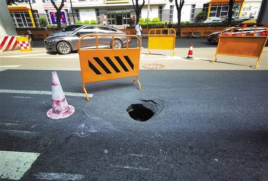 地陷发生后,市政抢修部门及时到现场进行处置。工作人员告诉记者,“目前并不清楚内部塌陷面积,所以施工计划暂为先将地表坑洞挖开,掌握内部塌陷情况,再用沙土填平。”