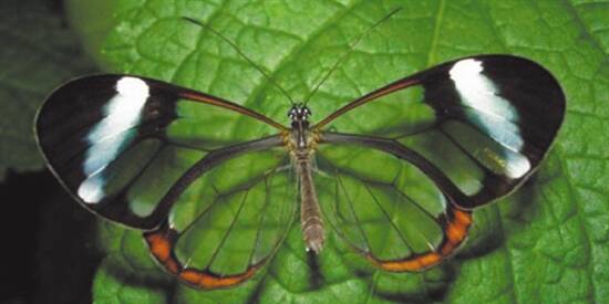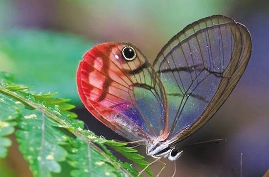 这一蝴蝶品种原产于中美洲和南美洲。不同于普通蝴蝶的是,它的翅膀上没有彩色鳞片。而普通蝴蝶翅膀上五彩斑斓的颜色都来自于它们的彩色鳞片。玻璃翼蝶因此看上去几乎透明,不过当光线呈现一定程度的折射时,它们透明的翅膀其实也会有类似于彩虹的颜色。所以玻璃翼蝶并不是看不见的,何况它们的翅膀边缘还有一圈棕褐色加白色的纹路,它们的身体也是棕色的。只是这些颜色跟大自然的色彩很接近,于是它们就像穿上一件自然进化的“隐身衣”,轻松地“消失”在大自然里。