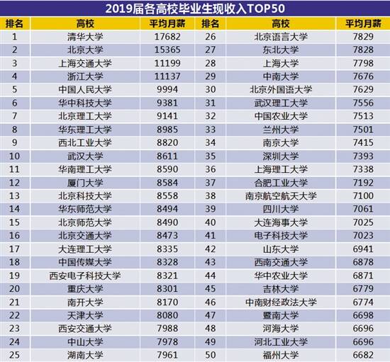 另外,智联招聘发布的对2019届毕业生的毕业院校及平均月薪进行追踪发现,毕业生收入高低与其毕业院校的等级形成强关联,毕业生收入排行前50名的高校多为双一流/211/985类大学。