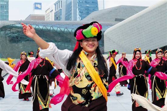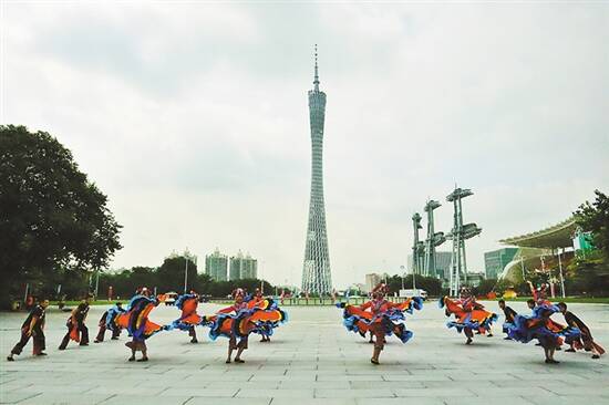 以广州塔为背景,贵州毕节歌舞团的演员们在花城广场跳起了彝族舞蹈