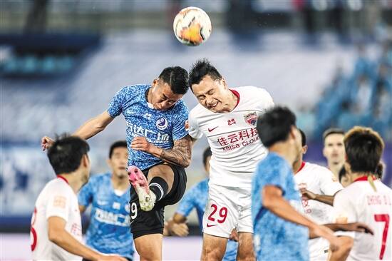 深圳佳兆业队球员郜林(上右)与大连人队球员孙铂(上左)在比赛中争顶 新华社发