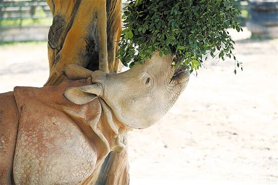 2019年3月,尼泊尔“国宝”亚洲独角犀曾在中国上海野生动物园亮相。野生的亚洲独角犀于上世纪初已在中国绝灭 图/视觉中国