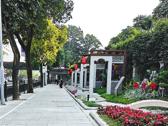 在解放路沿线迎宾馆等路段,壁画、景观小品等艺术形式,为市民带来眼前一亮的休闲体验。品质化提升工程为增加城市公共开放和休闲空间,在解放路沿线迎宾馆等路段新增口袋公园。在绿色的环境中加饰景观小品,呈现色彩单纯的艺术创作,简洁大方的线条与绿植相辅相成,营造环境整体性,增强园林景观建设。