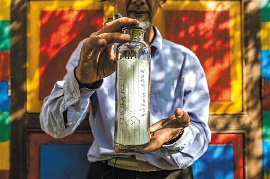 老人原本只是想做些力所能及的环保的事,每天背着一个大袋子在海边收拾玻璃垃圾,最后却为这些不同颜色、不同造型的玻璃瓶子而着迷,便将它们储存在一起,慢慢积累成了一道风景。