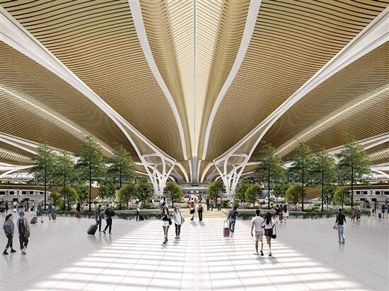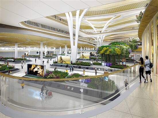 与T3航站楼一体化设计的,是轨道交通上方设置值机换乘大厅及综合交通中心。创造性把综合交通中心出港、到港流程分层分流,旅客导向清晰。轨道交通出港旅客同层值机及行李交运,轻松体验,愉悦出行,也同层换乘其他轨道交通,快捷高效。航站楼到港旅客在首层平层衔接交通中心,与各类公共交通无缝衔接,非常便捷。