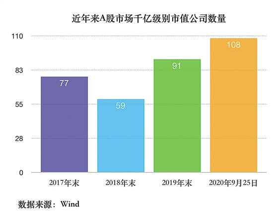 截至9月25日,A股总市值超千亿元公司已扩容至108家,较去年年末公司数增长近20%。2019年年末、2018年年末、2017年年末,千亿元级别市值公司数分别为91家、59家、77家。