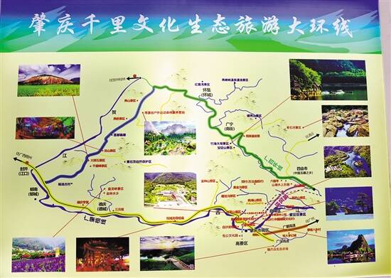 肇庆旅游资源丰富,种类齐全,以七星岩、鼎湖山为核心,沿西江的鼎湖砚洲岛和神谷国家森林小镇、高要紫云谷和回龙特色小镇、德庆悦城龙母祖庙和盘龙峡,沿贺江的广信文化园、封开龙山和大斑石、粤桂省际廊道美丽乡村,沿绥江的怀集寻源谷、广宁竹海大观、四会奇石河和贞山等众多历史文化和自然生态景观串珠成链,构成了美轮美奂的千里文化生态旅游大环线。
