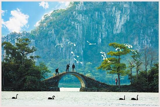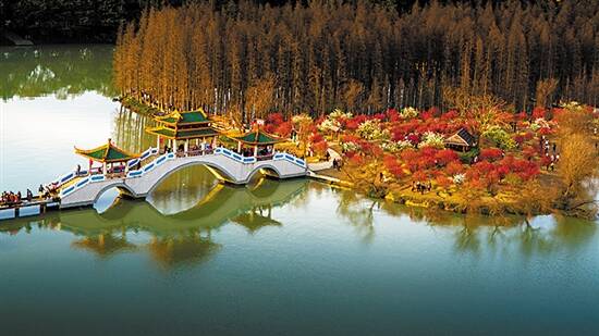 星湖国家湿地公园:自然风光绚丽,是中国亚热带最具典型性和代表性的岩溶湖泊湿地。秋天的星湖,秋风拂面,水杉渐红,水天一色,万鸟云集。鸟中有美丽名贵的丹顶鹤、火烈鸟等,被称为“南方鸟岛”。