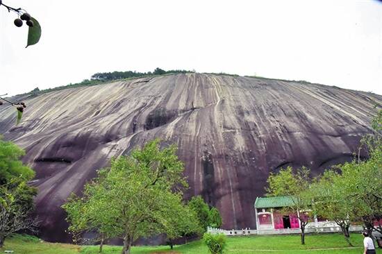 大斑石:一石成山,三面树木植被覆盖,一面光滑如镜,裸露出整个山体,壁立千仞,五彩斑谰,雄伟壮观。