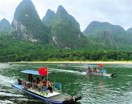 羊城晚报记者从阳朔站下车,乘坐客运车来到达兴坪古镇。在不远处的漓江上,上千艘竹筏船头悬挂五星红旗,迎风招展,十分壮观。