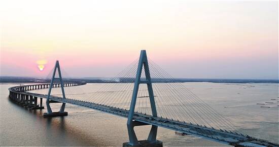 湛江东雷高速控制性工程通明海特大桥昨日顺利贯通,犹如大竖琴横于通明湾之上