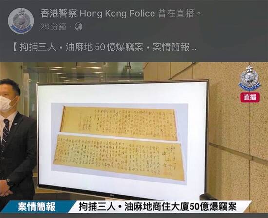 香港警方展示追回的赃物,图为被裁成两半的书法 (网络截图)