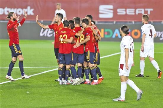 对阵瑞士,西班牙球员庆祝进球 新华社发