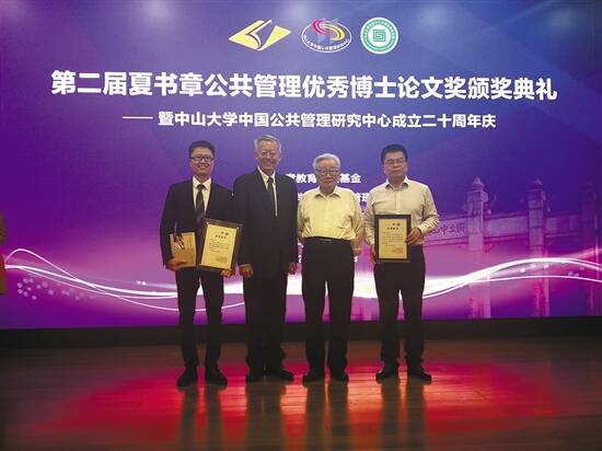 羊城晚报讯 记者陈亮,实习生夏嘉欣,通讯员何宛儒、吴立坚报道:第二届“夏书章公共管理优秀博士论文奖”颁奖典礼在中山大学举行。浙江大学毕业的黄飚博士所作《当代中国政府的试点选择》和中山大学毕业的博士王春晓所作《政策实验与卫生治理:基于福建三明医改的案例研究》荣获本届优秀论文奖。近二十位来自国内公共管理学界的知名学者参加了颁奖仪式。