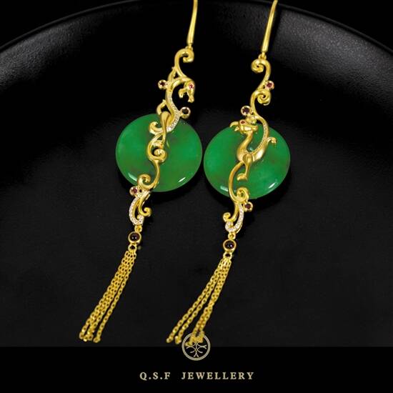 琪思坊《龙凤和鸣》翡翠耳环18k黄金钻石宝石镶嵌