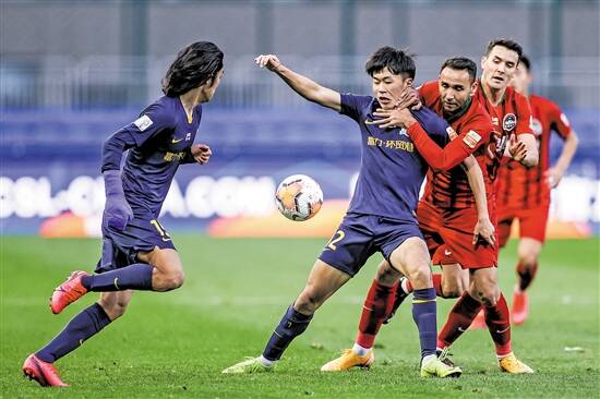 富力队小将王华鹏(左二)与对手拼抢 新华社发