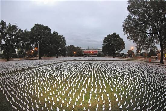 悼念新冠逝者 当地时间27日,美国华盛顿特区,当地艺术家在肯尼迪纪念体育场附近插上超过20万面小白旗,纪念因新冠肺炎去世的20多万人 图/人民视觉