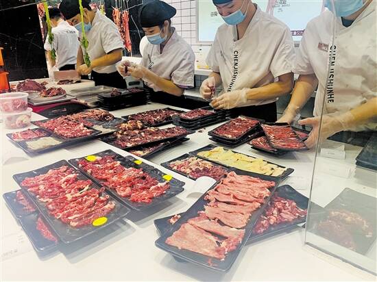 在陈记顺和天河南二路店,一进门便可看到一盘盘新鲜切放、整齐划一的牛肉,不禁让人胃口大开。据该店经理介绍,陈记顺和拥有自家的养牛场和加工场,精选3-4岁的土黄牛,且大都是潮汕农户自家散养的“走地牛”作为食材;同时,现切牛肉有着严格的内部上桌程序:每头牛从屠宰到送达至各个分店,不得超过4小时,保证新鲜。