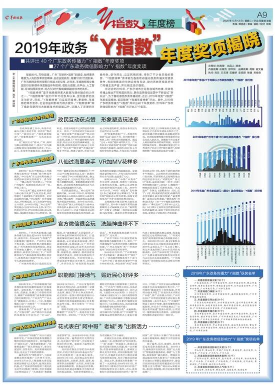 其中,羊城晚报建立的传媒智库,下沉到地方基层,打造了多个“新闻+政务”立体化传播地方形象的项目。智库建立的广东政务新媒体民生及舆情应对“Y指数”研究,使羊城晚报搭上大数据发展的快车,更有效地开展“新闻+政务”项目,实现全平台内容链条式、辐射式传播。