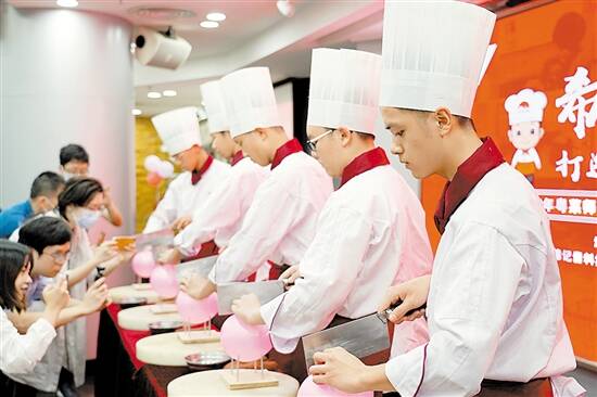 10月27日,粤菜师傅班开班仪式现场,学员表演气球上切萝卜丝